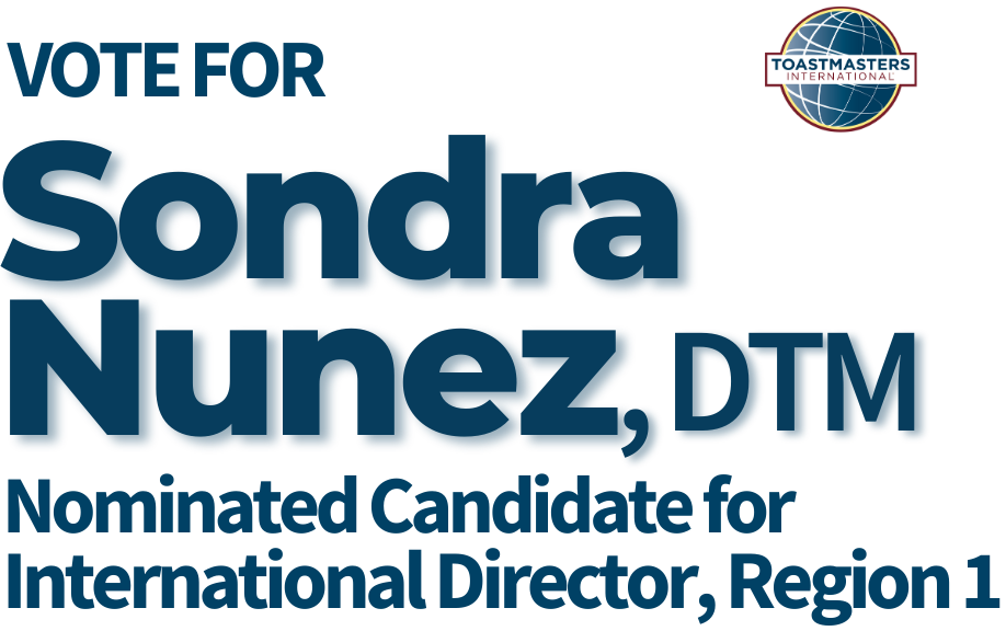 Sondra Nunez, DTM, has served in club, district, and region Toastmasters positions, culminating in her appointment as 2019-2021 Region 1 Advisor. Her work in Toastmasters was recognized with the 2020-2021 Toastmasters Presidential Citation, the highest honor bestowed on a member by our organization.
